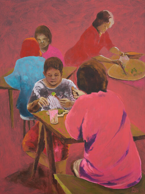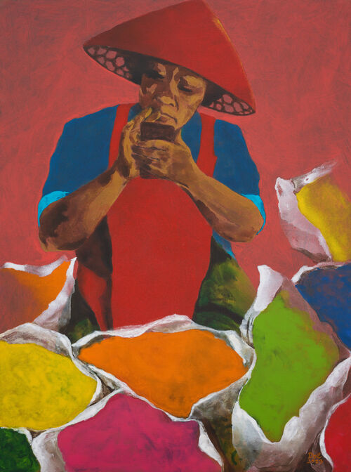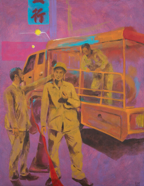Though he first trained as a sculptor, Thai artist Pawarest (Doe) Choksaen worked full-time as an art director at an advertising agency from 1997 to 2019. It was only at the age of 49 that the artist decided to pursue his art full-time. Today, with his solo exhibition at Richard Koh Fine Art, Choksaen presents a series of figurative paintings in “Conversations with Strangers,” where he employs a palette of electrifying hues to illustrate fleeting, often overlooked moments of connection with others. Drawing inspiration from his Bangkok community, his works are often quiet scenes of small groups or a single subject, like The Breakfast (2023), depicting older ladies sitting for a meal against a reddish backdrop. With these dreamlike purples, reds, and blues, Choksaen captures the essence of Thai life while also highlighting the universal human experience of connecting with others.