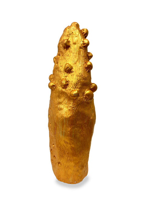 As a collage work on paper, What Happens on Earth Stays on Earth (2023) pulls together disparate iconographies into a complex picture. Elsewhere, in the sculpture series “Shabtis Gather,” Milad refers to her Honduran and Egyptian heritage in these sculptural works made of epoxy resin and decorated with acrylic paint. These pieces reimagine ancient Egyptian funerary figurines, which act as symbols of her heritage and remembrance, challenging viewers to reconsider the meanings we assign to cultural artifacts.