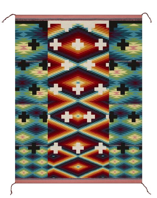For Cody, weaving is important as a Navajo tradition for self-sufficiency and spirituality. It’s imperative, she said, because “when we look back in 75 or 100 years, what we’re creating now is the tradition of our time.…It’s said that the spider woman gifted the knowledge of weaving and then the spider man brought the loom and the tools,” she explained. Together, they represent things in the natural world: The spider woman, in particular, weaves the sky and rainbow, protecting the Navajo from above. The abstract traditional textiles Cody and her fellow weavers make as blankets, clothes, and rugs are physical protection on Earth.