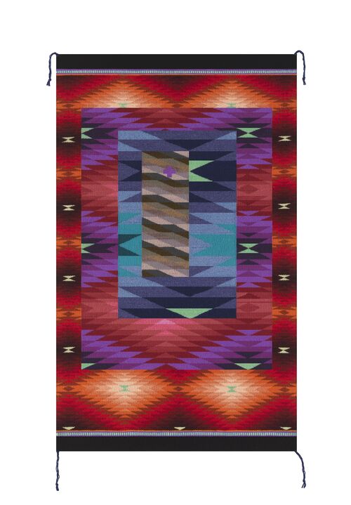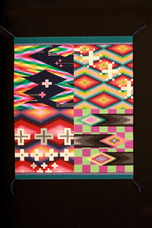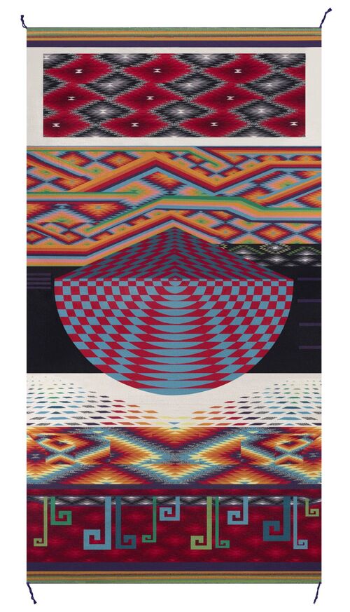 Cody’s abstract weavings address both the past and present existences of her Indigenous community. For example, she draws colors and patterns from the Germantown sampler—commercially made wool from Pennsylvania used to make the blankets the U.S. government gave the Navajo people when forcefully expelling them from ancestral lands. Her works touch on themes from her own life as a child growing up on the reservation, learning to weave from her mother at age five and selling those pieces as early as elementary school to afford the latest tech toy. This experience of digital life, too, makes its way into her layered geometric compositions: the “noble pixel,” she called it, referencing the technological developments that became widespread during her childhood.