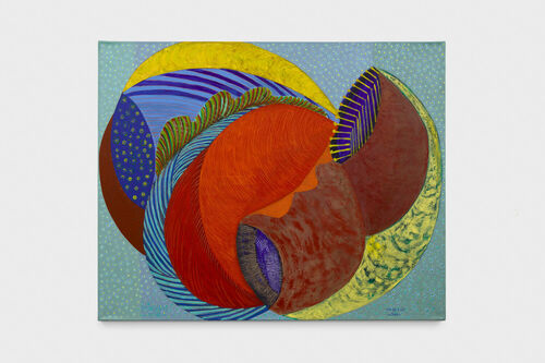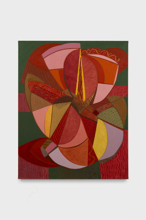Kim’s move to Argentina also allowed her to escape the prevailing trends in Seoul—such as photorealistic, narrative, and figurative works. Instead, she developed a more idiosyncratic visual language through her textured assemblages and paintings. In many ways, “Song of My Soul,” a series of paintings characterized by intense colors and kaleidoscopic abstract shapes, explores the same themes of equilibrium and metamorphosis as her sculpture practice. Kim brought sculptural techniques of addition and reduction to these works, using a knife to apply and scrape off paint.