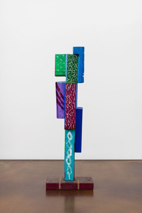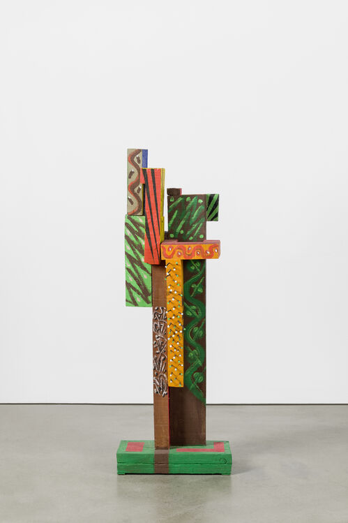 Ahead of her upcoming shows, Kim has been “immersed in the idea of organically integrating sculpture and painting into one work,” she said. Included in her presentation at Kukje, Add Two Add One, Divide Two Divide One 2019-19 (2019), a sculpture that appears to sprout from the ground, reflects this approach. Its assembled wooden components are painted with arresting colors and designs, including a vine running down the whole sculpture. After decades of parallel exploration in both painting and sculpture, Kim is mixing and matching materials and techniques from both aspects of her practice.