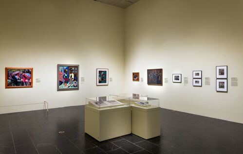However, this more nuanced approach to exhibiting Black artists has not always been the case. The first exhibition of African American–centered work in the U.S. took place at the Metropolitan Museum of Art in 1969. That show, “Harlem on My Mind: Cultural Capital of Black America, 1900–1968,” surveyed archival photographic and video work depicting Black life in Harlem. A 1967 press release announced the ambition to present Harlem’s “achievements and contribution into American life and to the City.” Yet very early on, committee members who had been assembled to advise on the show withdrew public support for the exhibition, critiquing the absence of art from Black artists. Despite significant warnings from these Black cultural leaders and artists, the opening went ahead, leading to protests organized by a group of artists including Romare Bearden, Henri Ghent, Norman Lewis, and Ed Taylor, under the name the Black Emergency Cultural Coalition (BECC). Several of their signs read, “Harlem on Whose Mind?”