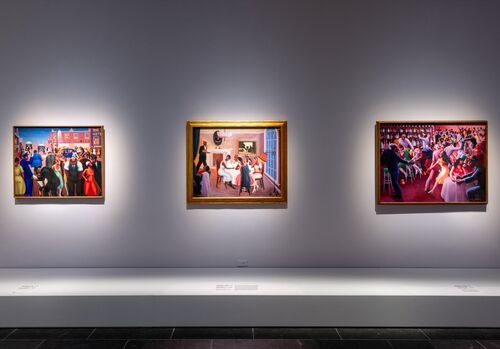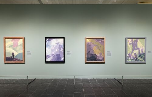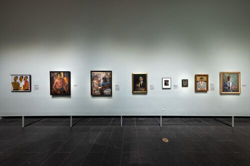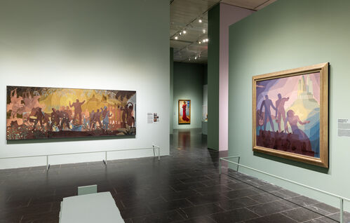 This institutional effort is clearly reflected in its current exhibition, which features a bold selection of African American artists who speak powerfully to the Black experience of the early 20th century. Featuring more than 160 artists working in painting, sculpture, film, and photography, the exhibition amplifies the complexity of Black life from the 1920s through ’40s. Rather than focusing on already well-known artists, the show uplifts lesser-known names, like Laura Wheeler Waring, whose lush paintings carefully portray prominent African American luminaries as well as impressionistic rural landscapes; or little-known artist Suzanna Ogunjami, who crafted dignified, highly textured portraits of prominent Harlem Renaissance and West African figures as well as contemplative still lifes.