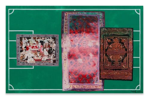 During a stroll through Lisbon, Xie Nanxing stumbled upon a notebook, its pages a vibrant green and adorned with the crisp white lines of a football pitch. Inspired by this unexpected find, Xie was prompted to create a series of eight paintings, the collection titled “f o r a d e c a s a,” a playful nod to the Portuguese phrase for “the away game.”