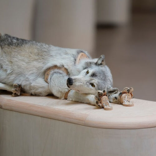 These two animatronic sculptures are constantly moving, shifting, and transforming to unveil their intricate mechanisms, emulating hand-held plush-puppet toys. Although this animal is traditionally seen as a predator, here, the wolf is seen as a pitiable, sympathetic creature, reducing it to little more than a limp rag doll. These two sculptures sum up ideas at the heart of Bismarck’s work, which explores the constructed notion of nature, and most especially the conceptual division between man from his surroundings.