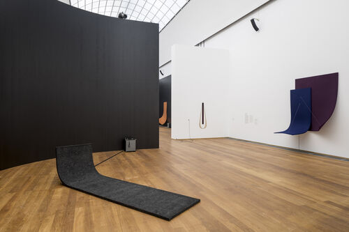 Her current burgundy- and purple-colored works for the Berlin show (all 2023) are made from a lighter form of felt, which allows sound to penetrate into their surfaces. The saturated color palette was inspired by recent trips to the deserts out West, which also allowed the artist to replicate “the slopes and hills that resemble the curves of the body.”
