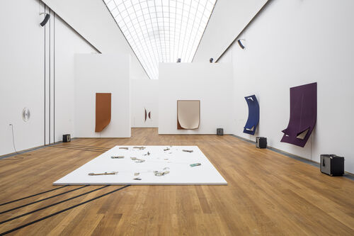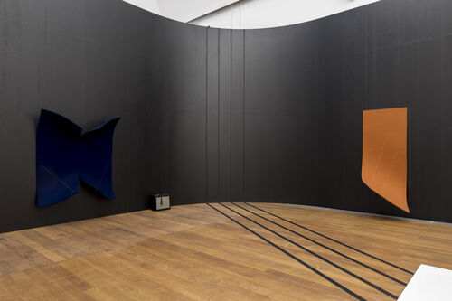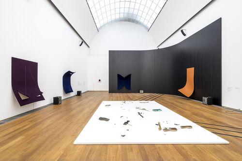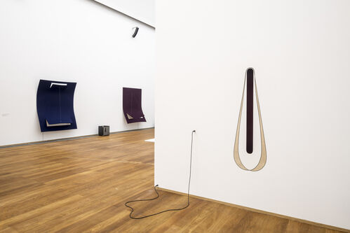 In the Hamburger Bahnhof show, these felt works are placed adjacent to a set of works by Joseph Beuys that also use felt. Both artists make use of the material’s fuzzy touch and sandy texture to convey warm comfort, but also a sense of alarm. While World War II–induced trauma was the main catalyst for Beuys’s suits and blankets in the material, for Tsabar, felt is connected with audio.