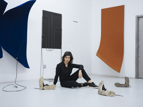 These works are also connected to her own experience as a queer woman, since her work is activated through intimate invitations to touch and play, and she exclusively hires women musicians and singers to perform using her works. All dressed in black, these collaborators always include her life partner, Sarah Strauss, as well as, for the Berlin show, Berlin-based cellist Julia Biłat or Argentine drummer Tatiana Heuman. One woman might sing to the tunes played through a smashed guitar, another might gently wave her arm to rub the strings of a felt structure.
