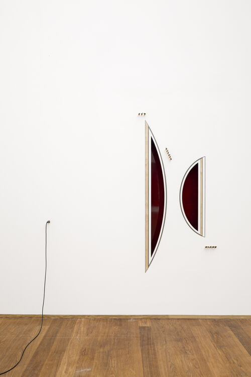 While in this series, the artist works with the firmness of these instruments’ hardware, another series, titled “Work On Felt,” takes a much softer approach, using the velvety titular material, which she’s worked with for over a decade. Perhaps Tsabar’s most recognized body of work, the large slabs of felt are carved with various patterns, and attached to tight strings that transform each sculpture into a musical instrument, with a connected amplifier elevating the melodies created by soft felt and metal cord.