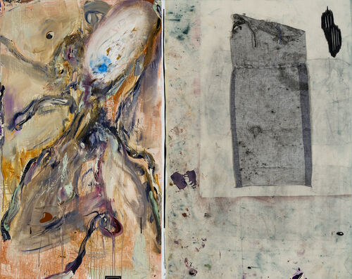 It’s a two-sided canvas: One half is full of color, the other gray, and nearly empty. In 2020, Manuel Mathieu first debuted his large-scale painting Sacred Burden, made earlier that year in response to ongoing political instability in Haiti. In an interview, he called the acrylic, chalk, charcoal, fabric, and tape on canvas painting “really powerful,” repeating the “really” several times, noting its links to the politics of the Caribbean nation.
