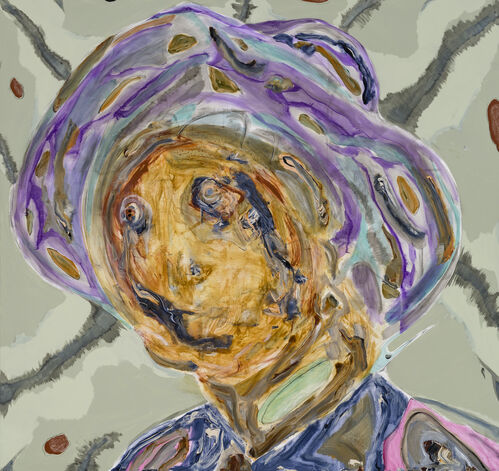 “Haiti is a matriarchal society. Men might think they run things, but I think it’s women [who do.] Francois was such a strong character that I felt like I needed to underline the presence of his wife, Simone,” said Mathieu. In the painting, the former first lady’s face is distorted, her features unclear beneath a purple hat—perhaps a nod to the largely invisible power she wielded as the first lady during her husband’s presidency and defacto leader after the death of her husband and during the first few years of her son’s rule.