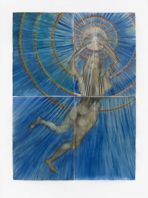 In 1995, she moved to Germany, studying with Greek Arte Povera legend Jannis Kounellis and conceptual pioneer Rosemarie Trockel in Düsseldorf, before moving to Berlin. It was also during this period that she began exploring Santería, a religious tradition with roots in Cuba and the Yoruban nations of West Africa, into which she was initiated by a priestess. With its emphasis on nature-oriented rituals and the overlap between the worlds of the living and dead, it now forms a huge part of the way she sees the world. “There is before Santería, and after Santería,” Vásquez de la Horra said of her art practice. Saludos a Olorum (“Greetings to Olorum”) (2019), a typical “after Santería” work, references the Yoruba god of the skies, and shows a nude female silhouette saluting the sun.
