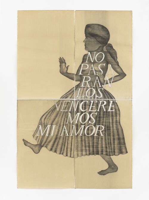 The artist’s early years in Chile had a large impact on her work. Vásquez de la Horra grew up under the 17-year-long rule of Augusto Pinochet, a time during which she remembers seeing tearful protests on her way home from school. “I grew up in this. For me, it’s impossible to ignore it,” she said, though she alludes to this spirit of resistance sparingly, rather than making it an explicit focus of her practice. No pasarán los venceremos mi amor (2020), for example, obliquely references political defiance in its title (“They won’t pass we’ll defeat them my love” in English), which appears spread across the outline of a petticoated woman.