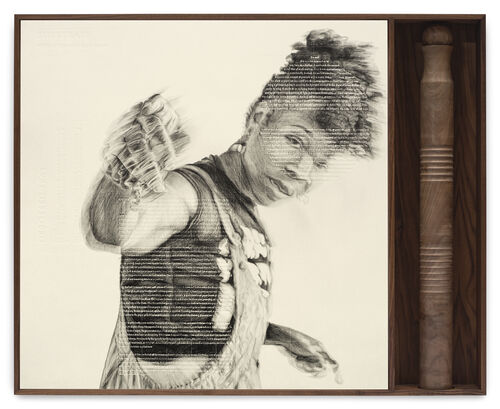 With words faintly debossed into the igarashi kozo paper surfaces of hand-drawn portraits of Black women in motion, such as planar vessel XXIX (marcella) (2024), Davis revisits histories of Black excellence across fields such as choreography and music composition. Meanwhile, in the 12 powdered indigo pigment drawings depicting clouds and created from snapshots the artist took of the sky, the debossed text draws on the work of physicist Carlo Rovelli. Cerebral, complex, and immensely detailed, across all three series, the artist’s exceptional draftsmanship and capacity to capture movement and energy shines through.