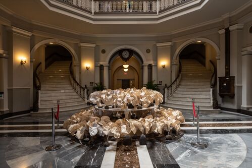 A graduate exchange trip to the Bay Area in California would plant the seed for Akamine’s socially and environmentally conscious projects. She returned to Hawaii, where she conceived the traveling installation Ku’u One Hanau (1999), using her background in construction to build tents out of the Hawaiian flag to address the issue of homelessness among Indigenous Hawaiians. In Kalo (2015), she created paper sculptures resembling taro leaves, made out of historical anti-annexation petitions, reminding the audience of Hawaiian rights to sovereignty. As part of the series “Pololia” (2021), she crafted copper wire and glass beads into floating jellyfish—harbingers of the warming oceans due to climate change.