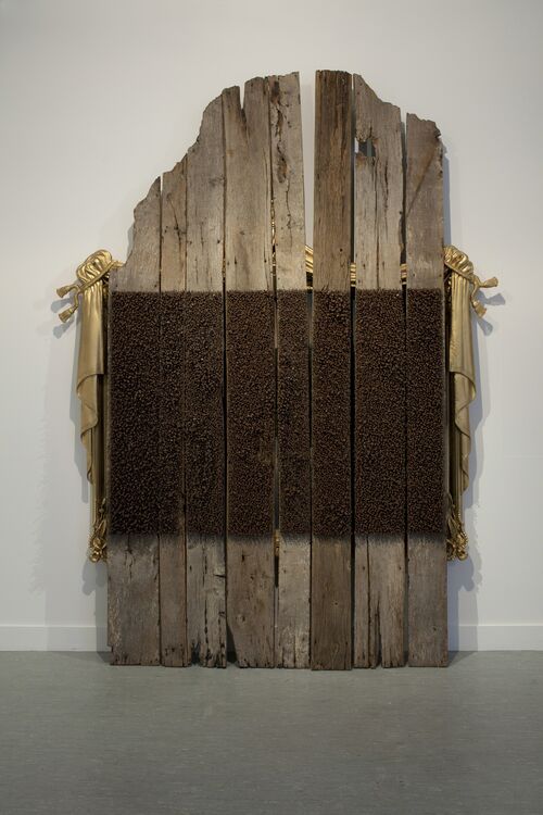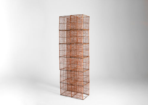 In these installations, Kim “bandages” these neglected objects as an act of healing and caretaking, recalling her training as a nurse, a job she held while earning her art degree. The intensive labor is still a part of her most recent sculptures, which are wrapped with copper wire or gauze. A seemingly mundane vessel, such as an empty crate, is thereby transformed into a thing of beauty.