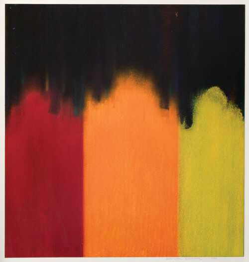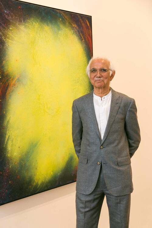 In the 1960s, Bhavsar arrived in New York City, where his instinctual approach gained recognition alongside other Abstract Expressionists like Mark Rothko. His paintings shift freely from blocks of color to organic bursts and layered compositions, revealing his origins’ influence. For example, his particular technique of sifting powdered pigments onto the canvas to create elaborate patterns using different, brightly colored powders is influenced by the festive Indian tradition of rangoli. Thus, a lifetime of artmaking has brought Bhavsar full circle.