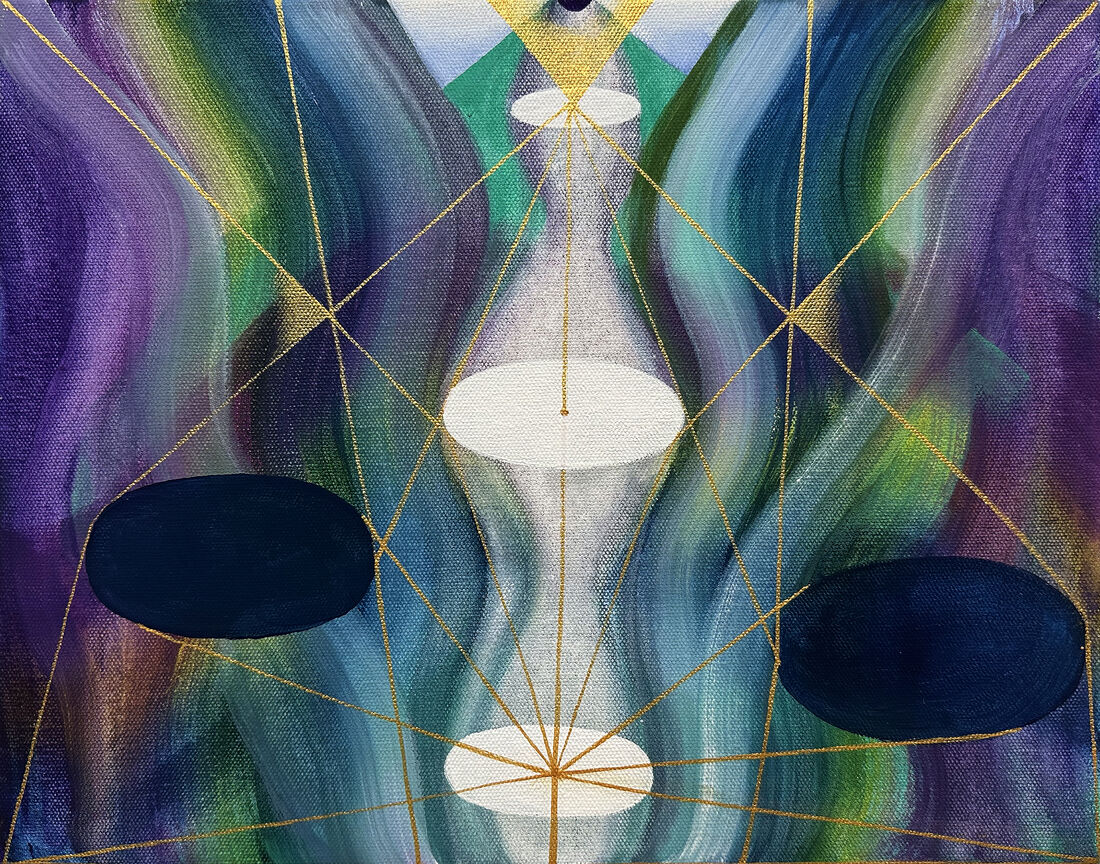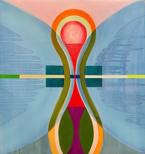 Inspired by everything from Buddhist cave paintings to European ornamentation, she draws on symbols from Eastern and Western mythology to deconstruct binaries while also transcending them. Her paintings possess a kaleidoscopic quality, balancing order and chaos through geometric and free-flowing shapes. Motifs such as a tree or the sun often gesture to the spiritual, though her practice tends toward personal introspection.