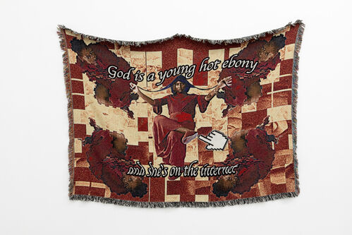 “The hand-beaded tapestries of textile artist Qualeasha Wood are self-portraits of the artist herself, often presented as a religious idol. Creating textiles out of digital images, Wood’s reframed self-portraits complicate the racialized and gendered hierarchy of looking. These works also critique the ways that the labor and cultural production of Black femmes has been historically exploited.”
