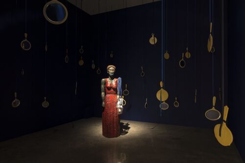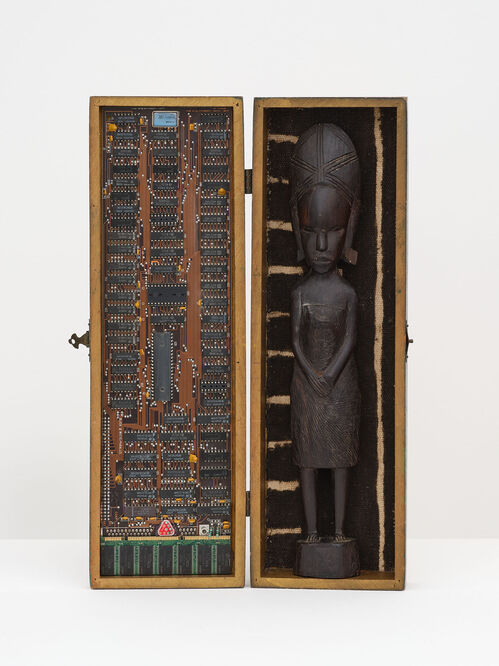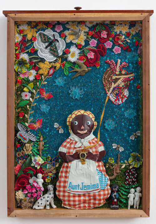 Self-taught “citizen artist” vanessa german also erects emancipated, empowered figures from found objects. Modeled after Congolese Nkisi sculptures, she incorporates ritualistic totems and folk art in her assemblages along with “American Dream” paraphernalia, junk drawer bric-a-brac, and various organic materials like quartz and seashells. In her mixed-media construction Aunt Jemima and All Points In Space and Time are Connected (2020), german pays homage to Betye Saar’s Aunt Jemima assemblage by enshrining the mammy character and her miniature revolver in an appliquéd wooden drawer.