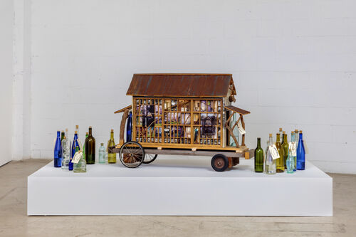 Exhilarated by Saar’s ability to render the ordinary extraordinary and the large scale of her installations, Moody spent 12 years planning and building her most well-known work, N.O.M.A.D. (2015), a 150-square-foot mobile live-work structure crafted entirely from reclaimed materials like washing machine doors and barnwood floors. Her sculpture Sweat Equity (2004), featured in Francois Ghebaly’s presentation at Frieze Los Angeles, is also on wheels, a nod to her peripatetic lifestyle. Modeled from corrugated metal siding, glass bottles, newspaper print, and archival photographs, the mobile house simultaneously critiques current discriminatory housing policies and celebrates the resilience of the artist’s ancestors.