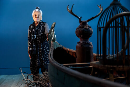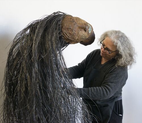 Her large-scale site-specific installation Drifting Toward Twilight (2023), on view now at the Huntington in San Marino, California, envisages this liminal space where past and present meet. A 17-foot-long canoe built during World War II, and loaded with antlers, birdcages, and miniature chairs, rests on a bed of newly culled branches from the Huntington’s Botanical Gardens.