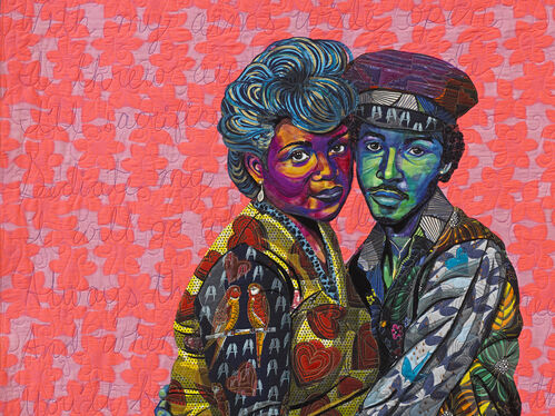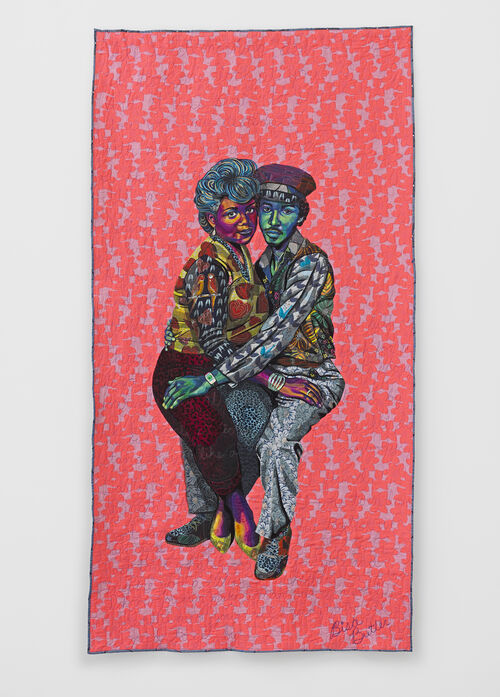 Like Saar, Butler collages personal effects, cultural artifacts, and traditional craft elements to tell emotionally resonant and critically restorative narratives. Constructed from innumerable layers of fabric and intricate appliqué, Butler incorporates a miscellany of textiles and embellishments, including scraps from her grandmother’s sewing kit, Kente cloth from her father’s birthplace in Ghana, and, recently, glittery polyvinyl from the 1980s.