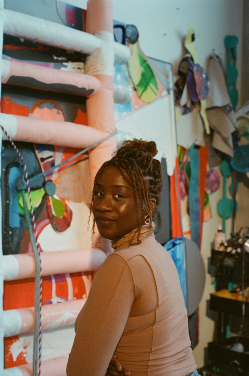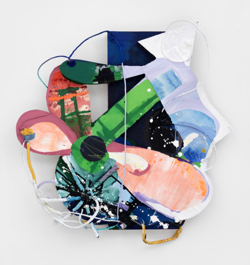 Like Butler, mixed-media artist Rachel Eulena Williams found a model for using unconventional materials to portray a subjective feminine interiority in Saar. “It was a long time before I saw another artist who looked like me [who was] using found objects,” explained Williams. “There was this very soft, very delicate, and loving energy to them…finally, a female perspective.” Constructed from recycled fabrics, scavenged hardware, wooden frames, and paint-soaked ropes, Williams’s vibrant wall-mounted assemblages conjure tenderness and aggression, vulnerability and defensiveness, grace and gravity.