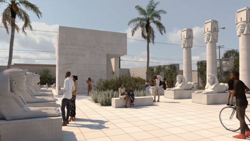 The installation, supported by the Mellon Foundation and presented by the Los Angeles Nomadic Division, will feature eight sphinxes and eight columns inspired by ancient Egyptian architecture, which are intricately carved with images of personal heroes, family members, and other community activists important to Halsey. Her non-profit, the Summaeverythang Community Center, will manage the site’s public programming, which will include film screenings, lecture series, youth outreach programs, music concerts, and more. This project, a massive white courtyard, mirrors her projects at the Hammer Museum in Los Angeles and the Metropolitan Museum of Art in New York, both in 2023, as well as her current sculptures that are included in the Venice Biennale.