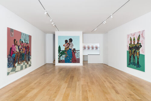 Though not on view, the work is a precursor to Akpojotor’s first solo exhibition at Rele in London, “Joy of More Worlds,” on view until June 8th, where the Nigerian artist shows her transition from the role of the daughter—guided by her foremothers—to a mother determined to preserve this lineage through her art. This shift is evidenced in her practice: Rather than working with archival photos of the women in her family, as in her previous series, her new body of work is focused on intimate moments with her daughter as a continuation of her matrilineal history.