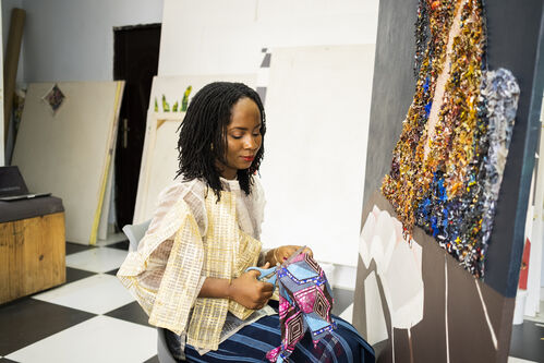Growing up in Lagos, where she still lives with her family, Akpojotor was first exposed to art when she apprenticed under her father, a sign painter who introduced her to stenciling, drawing, calligraphy, and more. At home, she would draw and paint her siblings until she became bored. Then, surrounded by her mother’s discarded Ankara fabrics—a textile made in Lagos that is deeply embedded in Nigerian culture—Akpojotor decided to mix her media. “I thought I wasn’t pushing myself enough, and then the idea came [to me] to switch the materials,” she said.