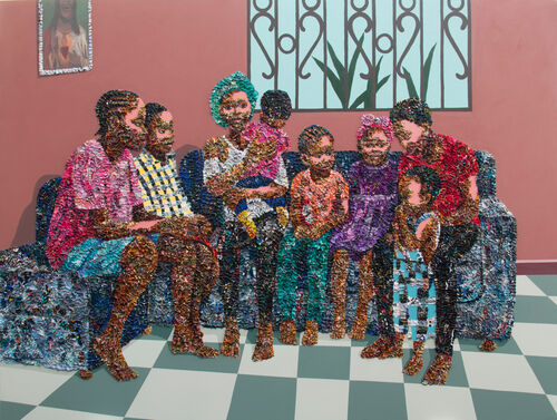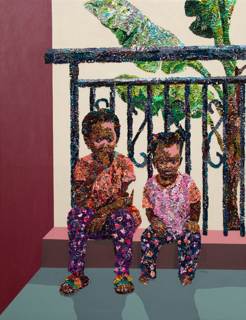 Each piece in “Joy of More Worlds” weaves a narrative that spans generations. One notable piece is Weekend with Grandma (2022), depicting Akpojotor’s mother with her two children, all staring at the horizon on a balcony, their figures all formed by accumulations of small fabric pieces. Here, she explores the role of motherhood through the lens of her personal experience and the tension between her role as mother and daughter.