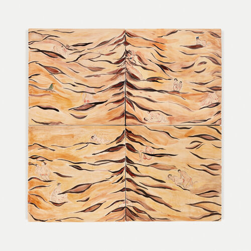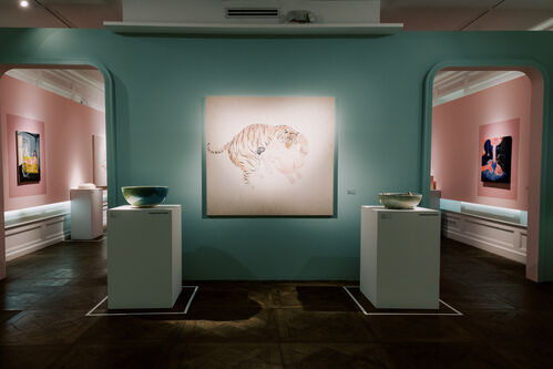Animals—specifically rabbits, pigs, and tigers—also cavort in Chinese artist Shafei Xia’s paintings and sculptures. Her surreal works feature big cats rolling among heaps of breasts on the top of ceramic cakes or lounging on the sofa observing humans having sex. Her depictions of these creatures in the works touches on our kinship with animals and conveys aspects of natural behavior that often feels remote in the contemporary world.