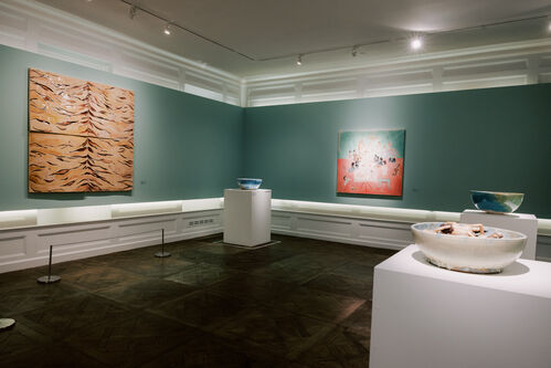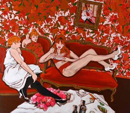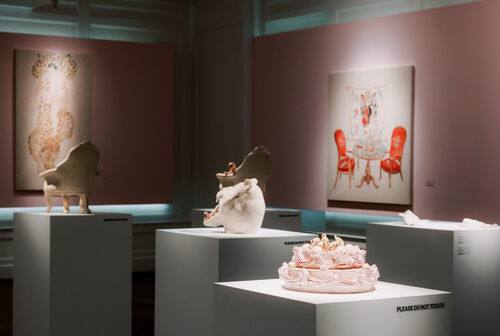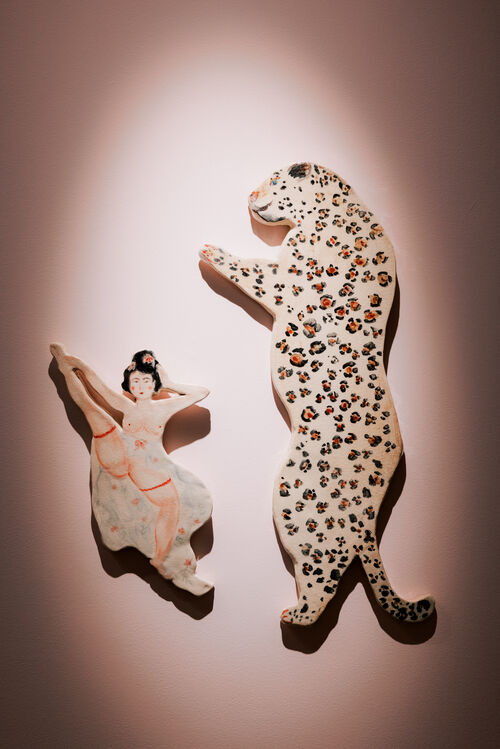 Polish Thai artist Oh de Laval explores 21st-century eroticism that takes in all aspects of sexuality, from lust, to despair, to happiness. Her bodies are rendered in thick, visceral strokes, surrounded by exaggerated Rococo-inspired interiors and abundant greenery. Japanese-born, Glasgow-based multimedia artist Tsuchiya, meanwhile, creates devilish ceramics, in which humans and creatures are caught in funny and erotic poses. In the show, she presents a ceramic bra with two fluffy pink rabbit faces over the breasts (Bunny Bra, 2023); a bowl filled with ceramic naked humans, a dog, a pig, and a teddy bear (Piggy’s Dream, 2022); and a figurine of a naked woman and a chimpanzee cuddling in bed (Max Mon Amour, 2020).