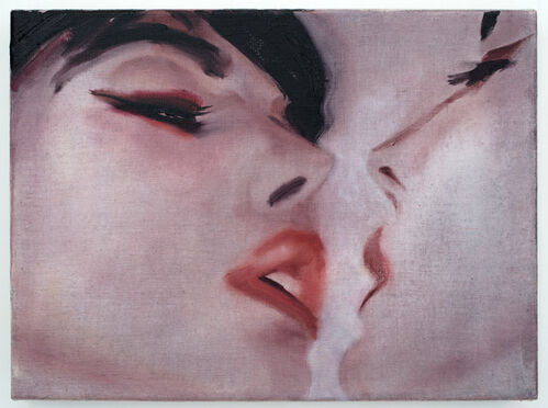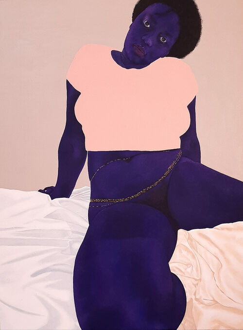 Nude bodies lounge and tumble throughout the show. Saudi-born Pakistani American painter Nadia Waheed’s Love, After Rego (2022) shows two figures lying in wild grass with their heads turned intimately towards one another. In Ugandan artist Stacey Gillian Abe’s R Is for Rosie (2021), a t-shirted figure, nude from the waist down, meets the viewer’s gaze with a confident stare. British painter Gill Button’s works are tinged with watery blues, homing in on female faces lost in moments of sensual pleasure.