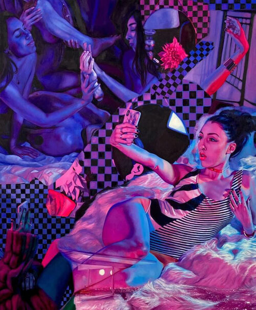 From Raw’s perspective, her painting practice offers her connection, bodily freedom, and psychological presence. She paints from both life and images found online, confronting viewers’ expectations around who female pleasure is for. “When you’re totally present, that’s when you’re really connected with everyone and everything around you, that’s what happiness is,” she said in an interview. “In nature, I feel totally connected with everything. When I’m painting models, I feel like I love every inch of them.”
