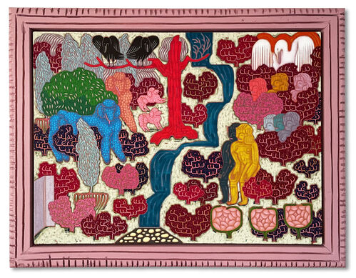 I’m particularly excited about the beautiful painting Great Bush (2022) by Sophie Larrimore, which was first exhibited at The Pit in Los Angeles. Great Bush uses Larrimore’s signature iconography of non-naturalistic poodles, birds, and trees rendered in bright colors. Its hand-carved frame accentuates the devotional nature of the painting, which references medieval tapestries, Indian and Persian miniature painting, Byzantine icons, Fauvism, and American textile traditions.