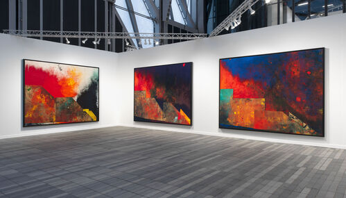 The four massive Sterling Ruby paintings at Gagosian’s booth are commanding anchors on the ground floor of Frieze New York. Drawing a sizeable crowd for most of the VIP day, these works, part of his acclaimed “TURBINE” series (2016–present), are crafted through Ruby’s distinctive process of overdyeing canvases, then laying them on the floor of his studio, where they accumulate layers of incidental and deliberate marks, from splashes of paint to footprints. “I have referred to [his work] a lot in the terms of archaeology…because elements of these [works] are from the paintings that happened before,” said senior director Serena Cattaneo Adorno.