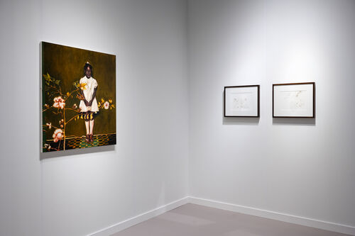 Among the larger pieces in the booth is a two meter diptych by Brazilian artist Rosana Paulino taken from the artist’s “Jatobás” series, which was on view in the 2022 Venice Biennale’s main exhibition “The Milk of Dreams.” Here, a pair of female figures are depicted as rooted into the ground, holding a handful of plants and flowers, respectively, that touch on themes of colonial structures and mythologies, which characterize the artist’s oeuvre.
