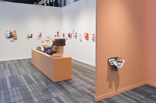 It’s rare that British artist Holly Hendry makes work that fits in the domestic space. Her solo booth with Stephen Friedman Gallery closely follows two massive public commissions in the United Kingdom: one at the Hayward Gallery and another installed at London’s Temple tube station. That said, the booth’s striking centerpiece, Weather Vein (2024)—an abstract sculpture evocative of internal organs, made from jesmonite, glass, steel, timber, leader, and paint—is around nine feet long. The works are priced at £6,500–£25,000 ($8,100–$31,300) per piece.