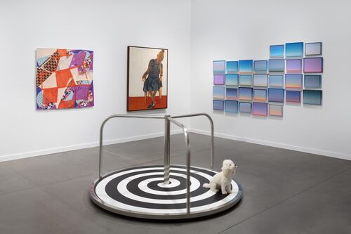 The most photographed artwork at Frieze New York is bound to be Elmgreen & Dragset’s Social Media (2024), a mesmerizing black-and-white merry-go-round with an unlikely passenger: a small stuffed white poodle. From the moment The Shed opened on VIP day, MASSIMODECARLO was a magnet for fairgoers; ironically, many took to social media and fulfilled the commentary made by the Danish and Norwegian artist duo.