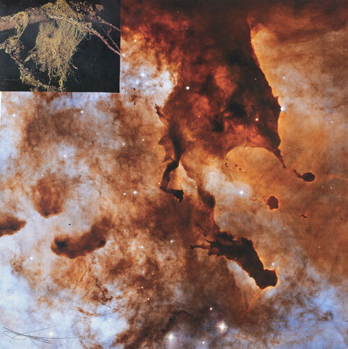 On the outer walls, Ruby’s “DRFTRS” series offers a smaller yet no less expansive exploration of scale and transformation. Here, Ruby juxtaposes microscopic images of biological elements, often excerpted from textbooks, with cosmic vistas. The resulting, intricate collages contemplate the interconnectedness of all life forms and forces, resonating with themes of evolution and entropy.