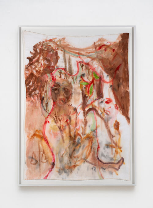 For example, in Varda Caivano’s canvas Untitled (2024), compositions appear trapped in a gestural rhythm, the result of a process where the Argentine artist works on the floor of her studio, applying paint on one side of the canvas before reversing and painting again to transfer color between both sides.
