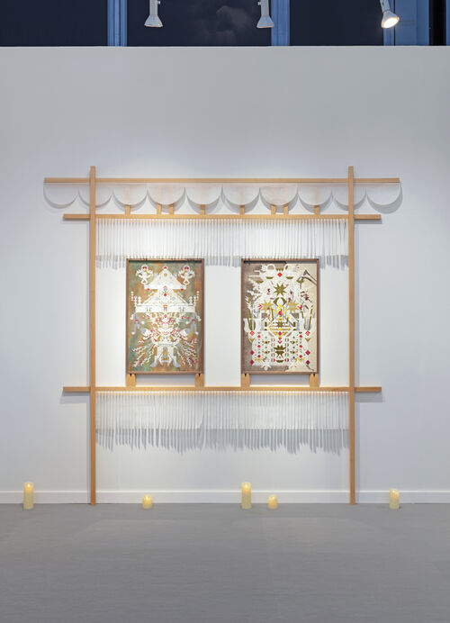 The works—priced from €27,000–€35,000 ($28,930–$37,500) apiece—are a part of Yang’s “Mesmerising Mesh” series, which began in 2021, and embody the artist’s ongoing investigation into the myriad paper traditions relating to spiritual and folk rituals. This exploration has taken the artist from traditions of Korean Shamanism to Judaism through to practices found in the Philippines and India, to name a few. “Yang thinks it’s very important to explain these kinds of traditions in different cultures because otherwise, it’s quite hard to understand,” noted Minkyung Ki, a production manager at the gallery.