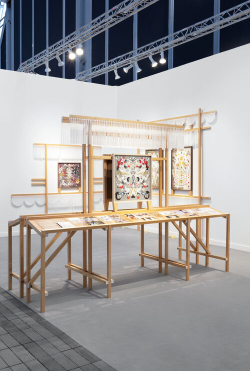 South Korean powerhouse Kukje Gallery’s booth in the corner of Frieze’s main section is a quietly dazzling display. Dedicated to a series of paper collages by Haegue Yang, the presentation features eight works hung within wooden structures, and accompanied by detailed explanatory texts, lending the feel of walking into a museum rather than a fair booth.
