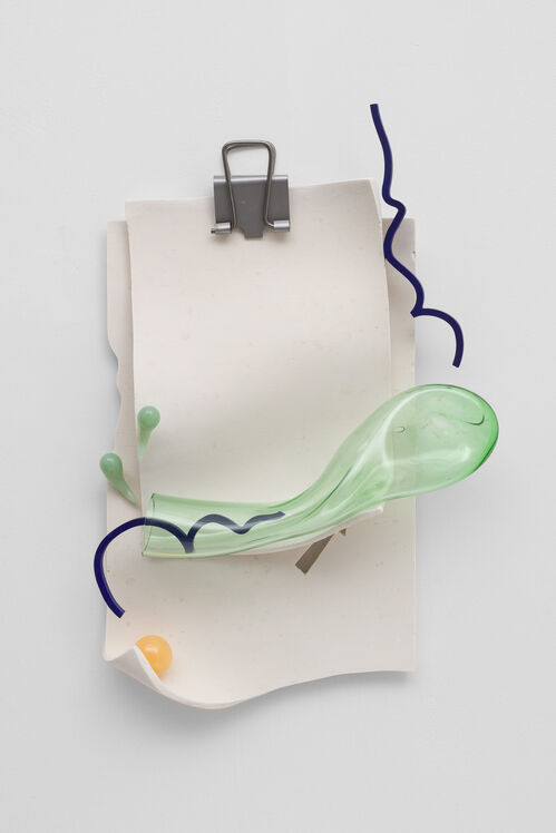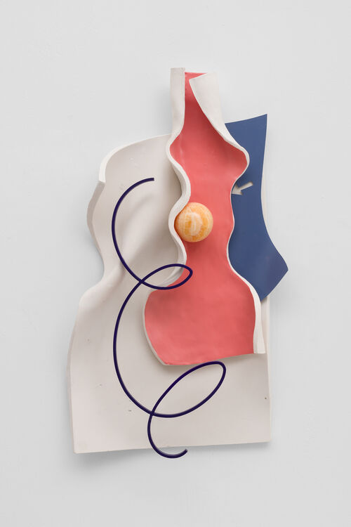 “This work is about bodily expectations or aspiration…in a way that relates vaguely to performing womanhood,” Hendry told Artsy. The large-scale sculpture is accompanied by 16 wall works depicting disembodied tongues, ears, bones, and other corporeal shapes. These works play with expectations of bodily autonomy, with titles such as Hormone and Peristalsis (all 2024).