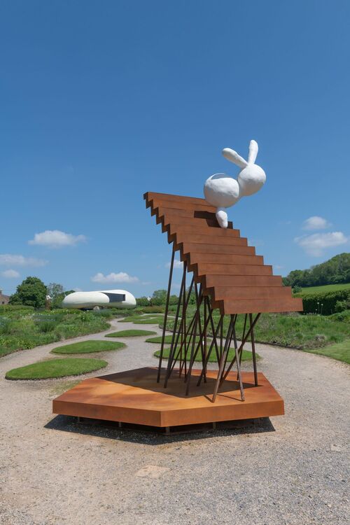 Barlow’s last completed works, “PRANK,” a series of seven sculptures made for New York’s City Hall Park in 2023, are on display in the Hauser & Wirth grounds. Large, ungainly versions of the domestic objects that were frequent motifs in her work, including sofas, chairs, and pianos, these works are complemented once again by bunny ears, returning full circle to the uncanny and Surrealist nature of some of her earlier work.