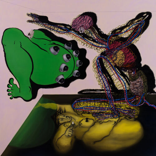 In the Zürich half of a two-part presentation (the other show, “Rumors” is at Mendes Wood DM in São Paolo), Ebecho Muslimova’s series of paintings portray Fatebe, the artist’s alter ego, in flat, cartoonish lines. This signature character frequently finds herself in contorted, surrealistic situations, visualizing desire as Goya-esque grotesquery amid skyscrapers and modern urban domesticity. In cheerful, irreverent paintings, Muslimova offers a vision of a liberated, playful female body.