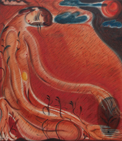 An MFA graduate of the Royal Danish Academy of Fine Art, Hungarian artist Kinga Bartis is currently presenting her debut Paris exhibition, “In a one,” at Galerie Marguo. The show features 12 new paintings conceived in the last five months as she’s traveled back and forth between Paris and her home in Copenhagen. These works span from expansive canvases to smaller, intimate pieces. Each painting renders its figures amid dreamlike landscapes awash with vivid, fiery colors.
